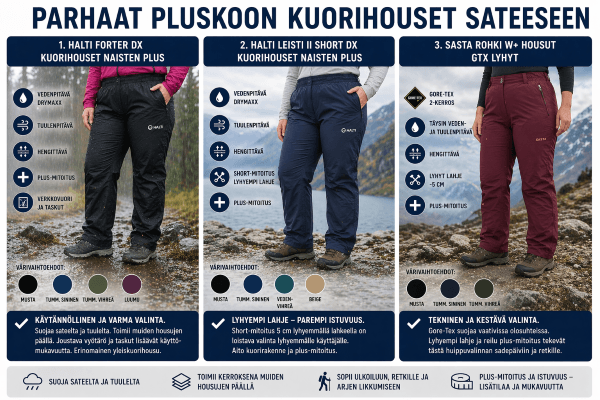 Useimmille paras käytännön valinta on Halti Forter DX Kuorihousut Naisten Plus. Teknistä kuorisuojaa ja lyhyempää lahjetta arvostavalle Sasta Rohki W+ Housut GTX Lyhyt on kiinnostava vaihtoehto.
