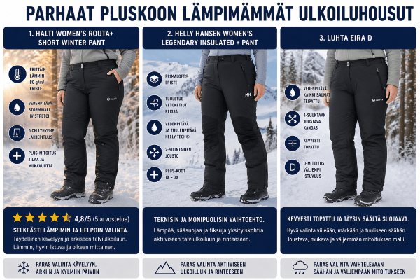Paras pluskoon lämpimämpi ulkoiluhousu: Halti Women’s Routa+ Short Winter Pant Paras pluskoon kuorihousu sateeseen: Halti Forter DX Kuosihousut